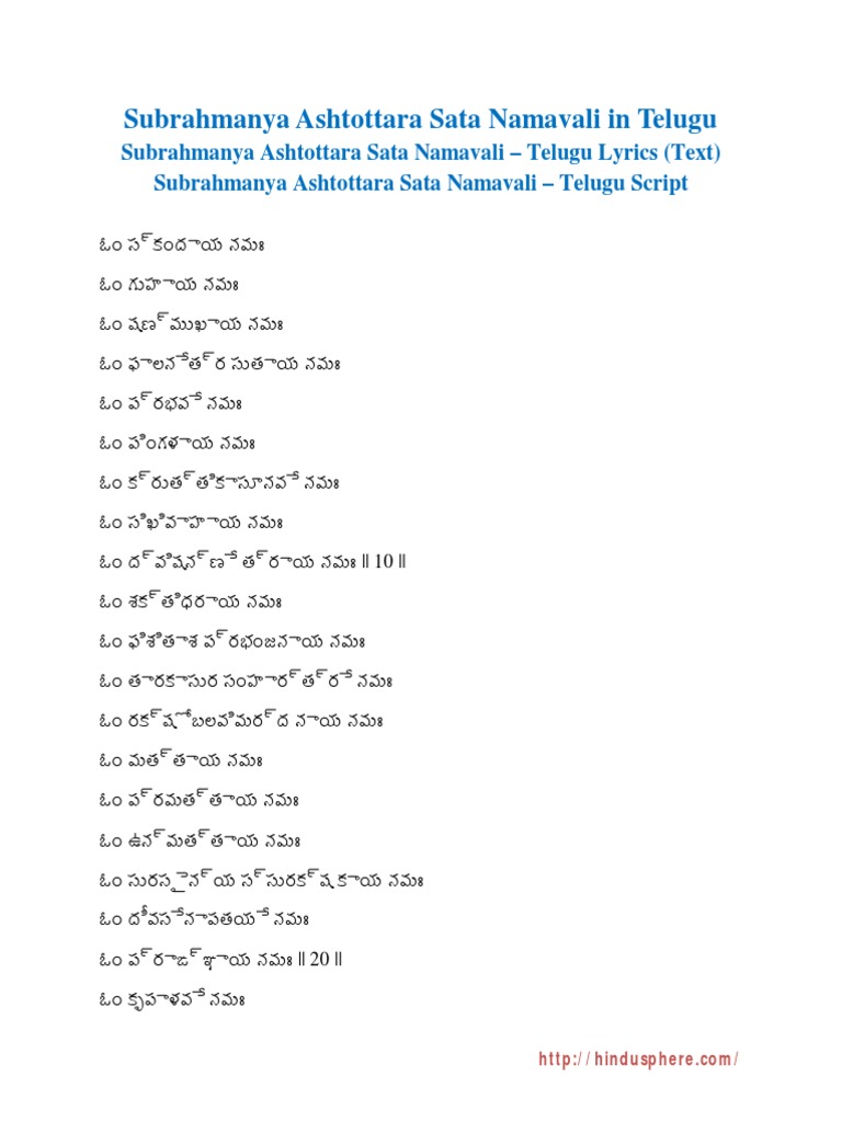 Subrahmanya Ashtottara Sata Namavali In Telugu Pdf Pdf